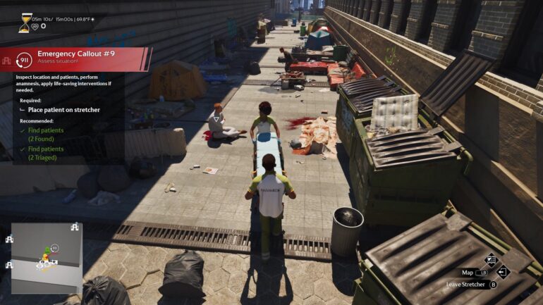 Même si les soins restent primordiaux, il faut également évoquer le trafic urbain, prévoir les embouteillages, déclencher la sirène afin que les automobilistes s’écartent de votre chemin, rendent les courses plus crédibles où le temps reste le maître mot et le coeur du gameplay. Parfois je suis tombé sur des comportements douteux, des voitures qui ne se décalaient pas pour me laisser passer bloquer la circulation lors d’une urgence. J’ai eu également quelques bugs mais rien d’alarmant. Ambulance Life simulator intègre des interventions mineure et parfois majeures avec des accidents de grande ampleur, avec une focalisation sur le tri des victimes. J’avais l’impression d’être dans Grey’s Anatomy par moment. Ce qui m’a le plus déçu c’est le manque de coopéaration avec d’autres services d’urgences et unités de secours, ça manque de vie sans mauvais jeu de mots..