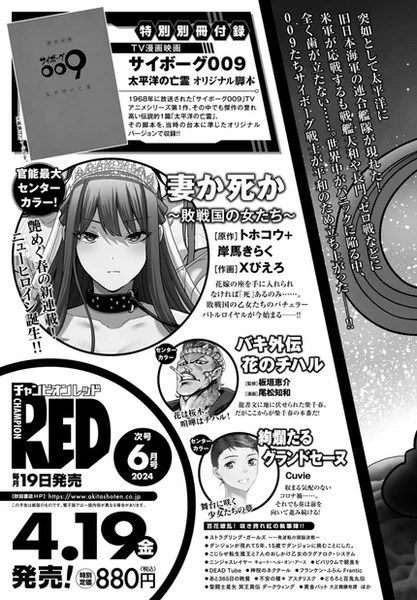 ans le numéro de mai du Champion RED (Akita Shoten), il a été annoncé mardi que les auteurs Tohokô et Kiraku Kirishima, en collaboration avec l’artiste XPierrot, sortiront dans la prochaine édition du magazine, le 19 avril, un nouveau manga intitulé « Tsuma ka Shi ka Haisenkoku no Onna » (Devenir une épouse ou mourir – Femme de pays vaincus –).
