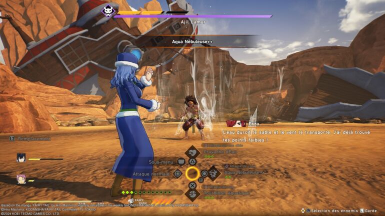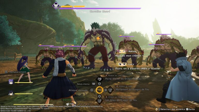 Mes premières impressions sont vraiment bonnes, je me retrouve idéalement dans l’animé et ce qui m’a le plus choqué, c’est la résolution graphique de cet opus, on voit clairement au premier coup d’œil qu’il y a eu des améliorations côté développement. C’est beau, c’est fluide, et même en zoomant sur les détails les moins intrigants, ça reste correct… Ce qui n’était pas le cas du premier sur PlayStation 4. Le système de combat a été revu pour être plus dynamique, plus dans l’action qu’un simple tour par tour basique. On retrouve la fameuse jauge ATB qui, une fois remplie, nous permet d’effectuer une action en temps réel, ce qui force également le joueur à prendre des décisions rapides, car l’adversaire joue également toutes ses cartes. Je me permets d’ailleurs de vous informer que je ne révélerai pas l’intrigue, malheureusement n’ayant pas terminé l’animé, j’ai eu le malheur de me faire spoiler par le jeu, ce n’est pas grave en soi, mais cependant, ce serait malhonnête de vous faire profiter de cette mésaventure et ne vous inquiétez pas, ça n’influera pas mon avis personnel sur ce Fairy Tail que j’aime beaucoup !