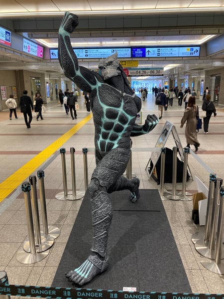 Annoncée le 26 avril, cette collaboration se déroule du 26 avril au 30 juin. Masaya Fukunishi, la voix de Kafka Hibino, s’est présentée en personne à la gare le 27 avril. La vedette de cette collaboration est une statue grandeur nature de Kaiju No. 8, dévoilée par Fukunishi lors d’une cérémonie d’inauguration à la boutique Kaiju No. 8 de la gare. Il a partagé une photo de lui près de la statue sur le compte Twitter de l’agence Ken Production le 27 avril. La statue est restée dans la gare pendant trois jours, du 26 au 29 avril, avant de partir en itinérance dans d’autres lieux :