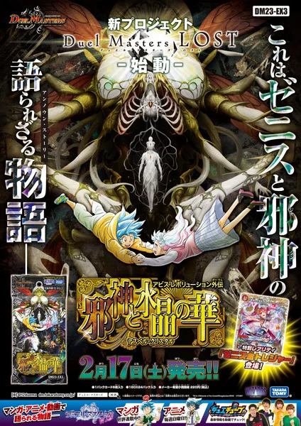 Le numéro de février du Monthly Coro Coro Comics (Shogakukan) a révélé lundi un nouveau projet s’inscrivant dans la licence Duel Masters de Shingenobu Matsumoto : Duel Masters LOST Tsuioku no Suishô. La sortie est prévue sur le site Weeky CoroCoro Comi le 1er février. Matsumoto est crédité pour l’œuvre d’origine, et Yô Kanebayashi dessine le manga. « LOST » est une « ligne temporelle alternative de l’histoire » qui progresse simultanément à celle de Duel Masters Win. Le manga Duel Masters LOST Tsuioku no Suishô dépeint un monde encore jamais vu auparavant. Il suit Kirifuda, âgé de seize ans (l’antagoniste de l’anime Duel Masters Win), alors qu’il a tout perdu. Il est entraîné dans un combat pour regagner le monde qu’il a autrefois désiré.