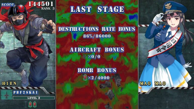 La bande-son constitue sans doute la meilleure réussite du jeu. Entre morceaux remixés issus des anciens épisodes et nouvelles compositions au ton héroïque, Sonic Wings Reunion fait vibrer la fibre nostalgique. Les thèmes de chaque niveau sont dynamiques, et les jingles de victoire rappellent immédiatement les bornes d’arcade des années 90. Les effets sonores, en revanche, peinent à suivre. Les explosions manquent de punch, les impacts de tir sont un peu mous, et l’ensemble donne une impression sonore “plate”. Rien de dramatique, mais dans un shoot’em up où chaque coup doit claquer comme une déflagration, ce manque d’intensité s’entend vite.
